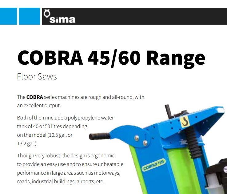 Píla Cobra 60 Range je profesionálna, vysokovýkonná a presná cestná píla určená pre najtvrdšie priemyselné chodníky, cesty, diaľnice, priemyselné priestory, letiská a veľké priestory. Je určená pre tie najnáročnejšie práce. Stroj zahŕňa mechanicky pokročilé prvky ako napríklad oceľový monoblokový podvozok. Má robustnú konštrukciu, aby zvládla aj tie najnáročnejšie podmienky. Pílu poháňa kvalitný a výkonný motor Honda GX630 s výkonom až 20,8 koní. Môže pracovať s kotúčmi s priemerom až 600 mm. Hĺbka rezu je maximálne až 200 mm. Nastavenie výšky rezu je zabezpečené pomocou kľuky a trapézovej tyče. Píla má veľkú plastovú nádrž na vodu s objemom 50 litrov. Ložiská koliesok sú chránené pred tlakovou vodou, pri umývaní stroja, pomocou rozbočovačov na oboch stranách kolies. Táto ochrana predlžuje životnosť ložísk. Zadné kolieska sú odolné proti prepichnutiu.
